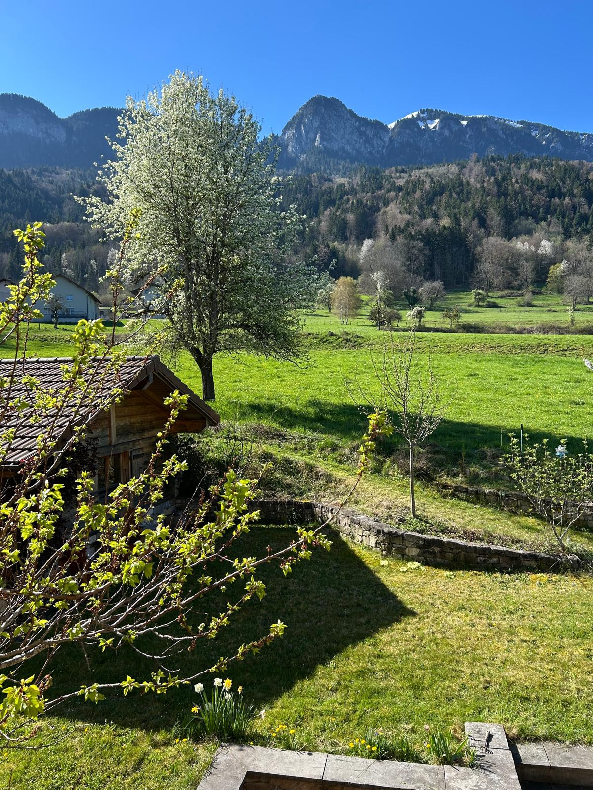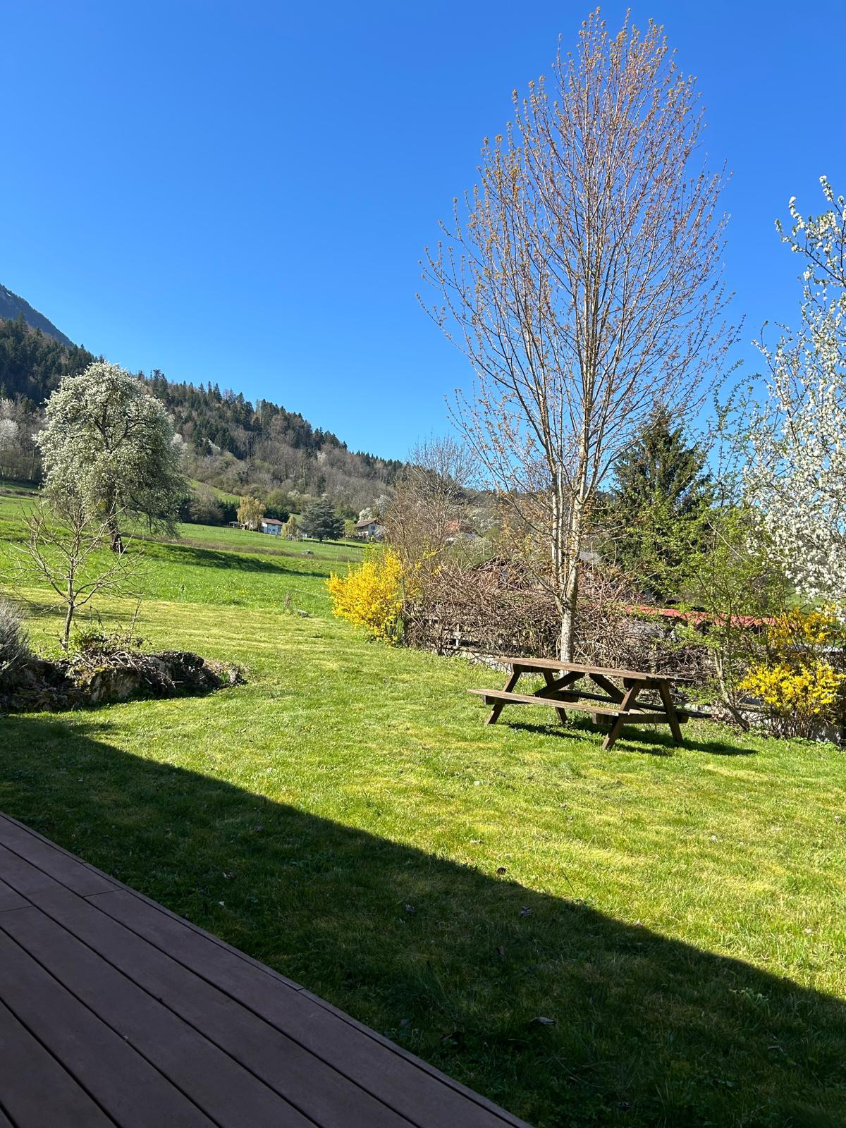 Terrain plat exposé sud/ouest, terrasses, vue montagnes, environnement calme et verdoyant. Arboré avec fruitiers et arbustes à la végétation étagée dans la saison.